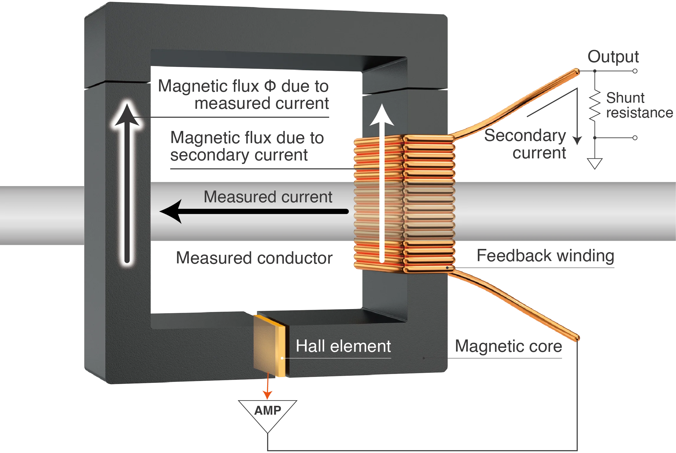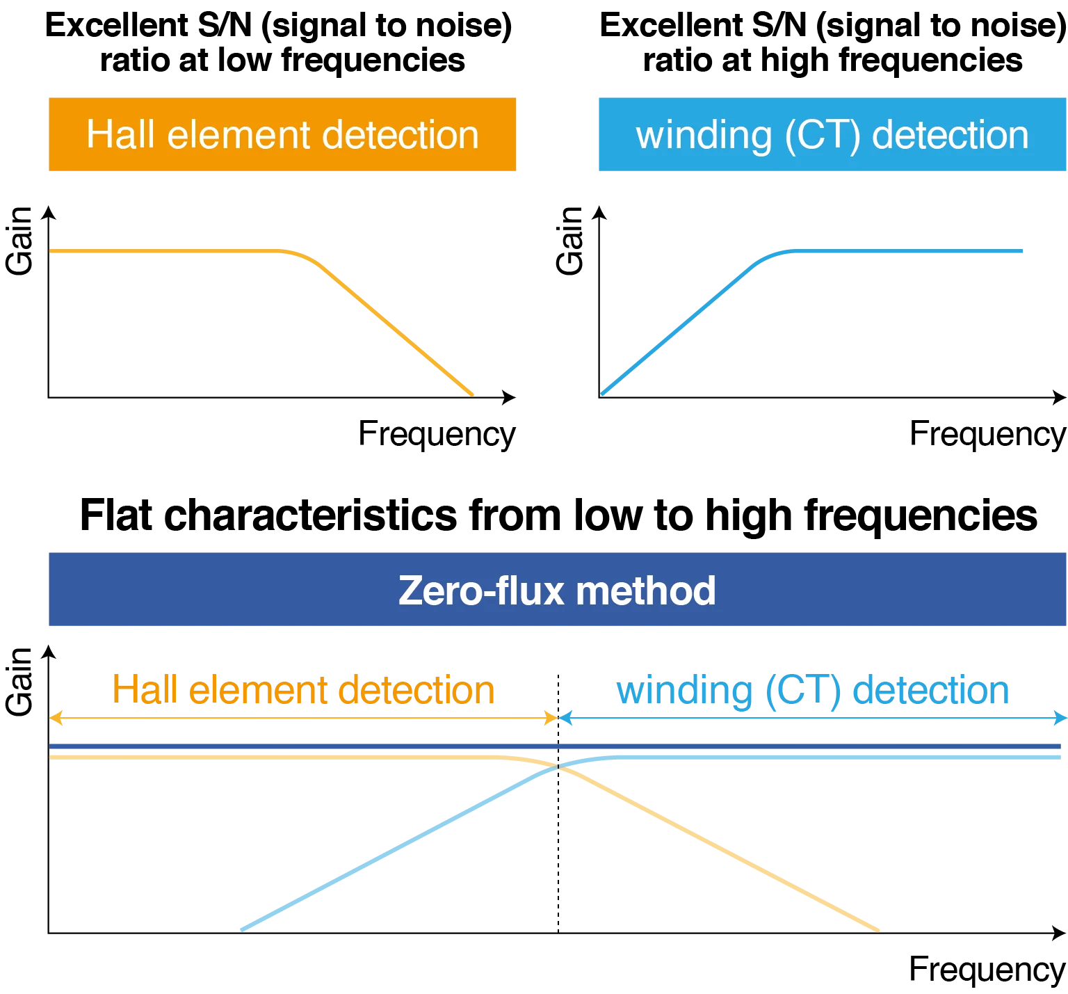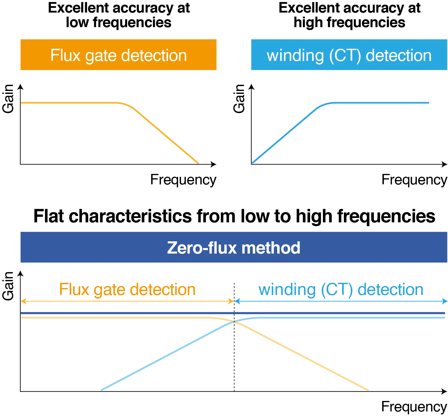 The two much more relevant zero-flux current sensor technologies are the ones that allow for the measurement of both AC and DC currents. In that case, DC and low frequencies are detected either with a fluxgate or a hall element.