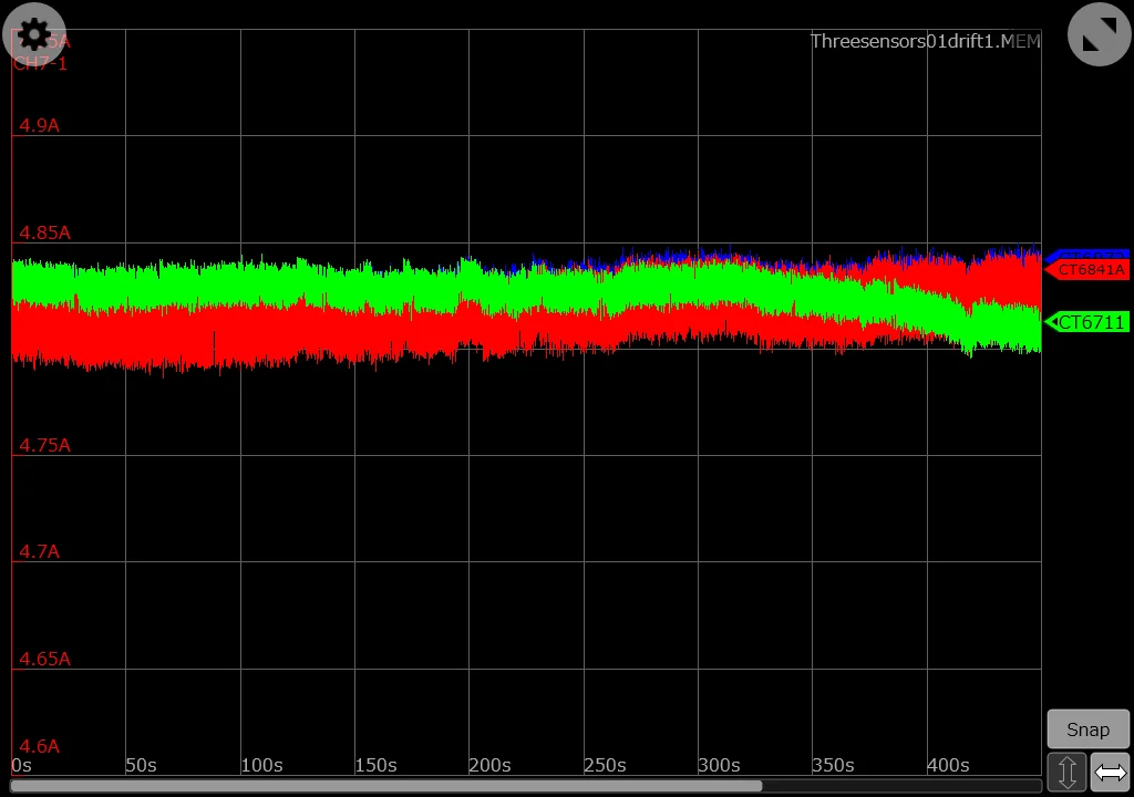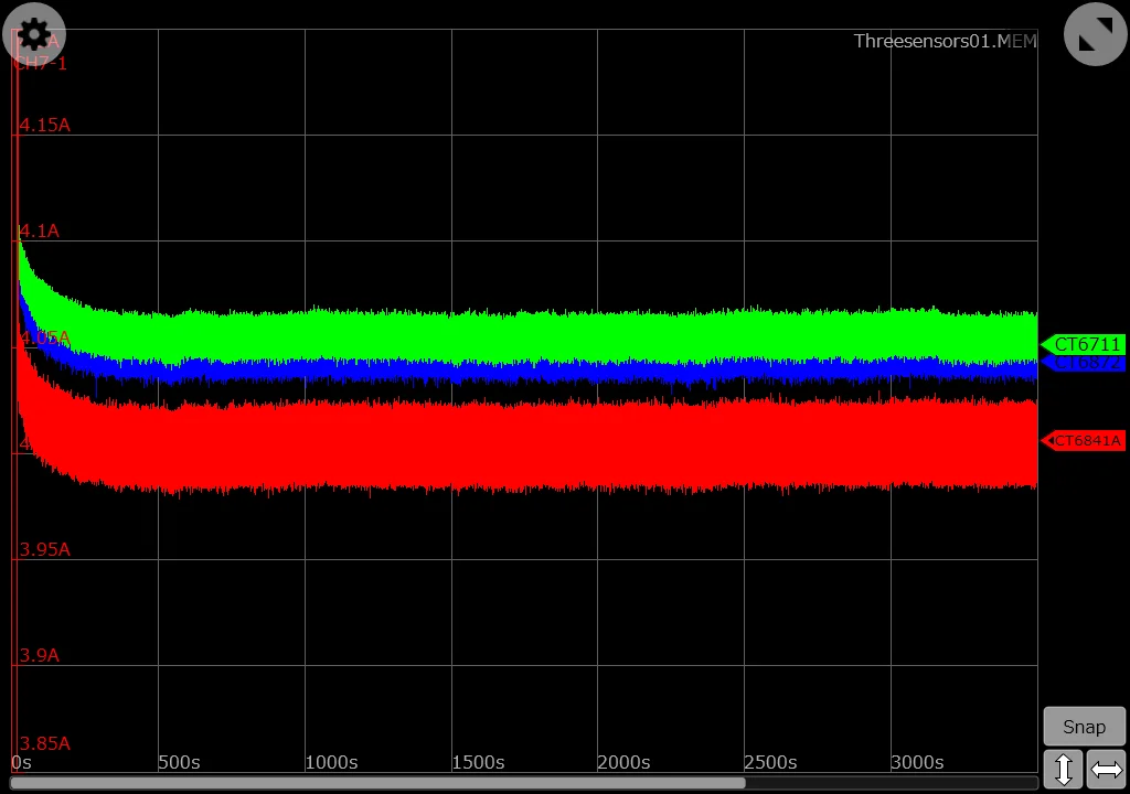 But as you can see there is no drift. Not at all. What you can see is that I have missed to zero-adjust the channels before starting the recording, which especially causes the CT6841A (red curve) to be displayed a little next to the other two measurement curves. While this was not intended, in this case it probably even helps to show that there are three curves on display. Because the CT6872 (blue curve) is hidden behind the curve of the CT6711 (green curve), here is the same recording with the CT6872 in front.