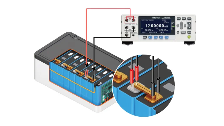 In addition to a very small measuring range, HIOKI‘s RM3545 has another function that is very useful in the production environment, which is checking the probe contact between the measuring device and the device under test during measurement: Here, the principle of 4-wire measurement is used to monitor that all 4 measuring contacts remain properly applied to the device under test during the measurement. This contact check function prevents measurements from being evaluated as “failed” due to incorrectly applied measuring contacts, and thus prevents flawless products from being sorted out erroneously.