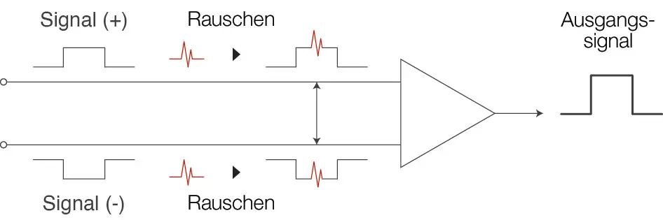 Damit ist selbst in einer stark gestörten Umgebung eine genaue Spannungsmessung möglich. Dies wird erreicht durch das Design des VT1005 mit einem potenzialfreien Differenzeingang. Gleichtaktstörungen werden eliminiert, indem das gleiche Störsignal an beiden Eingängen aufgenommen und im Differenzverstärker aufgehoben wird (Bild 1).