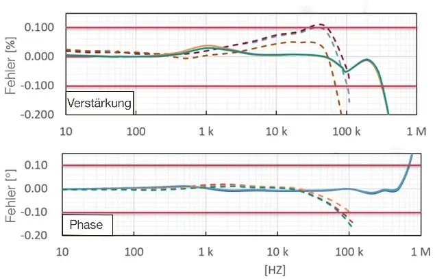 HIOKI entwickelt und fertigt sowohl den Hochspannungsteiler VT1005 als auch die Stromsensoren, die für die Kombination mit den ebenfalls selbst entwickelten HIOKI Leistungsanalysatoren optimiert sind. So kann bei aktivierter Phasenverschiebungskorrektur des Power Analyzers über den gesamten Frequenzbereich eine hohe Genauigkeit sowohl bei der Verstärkung als auch bei der Phasengenauigkeit erreicht werden (Bild 4).